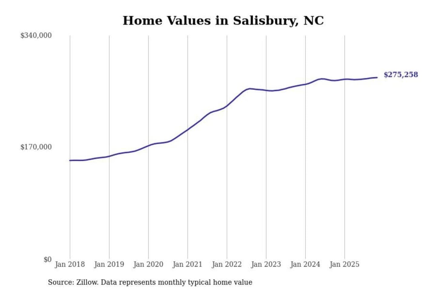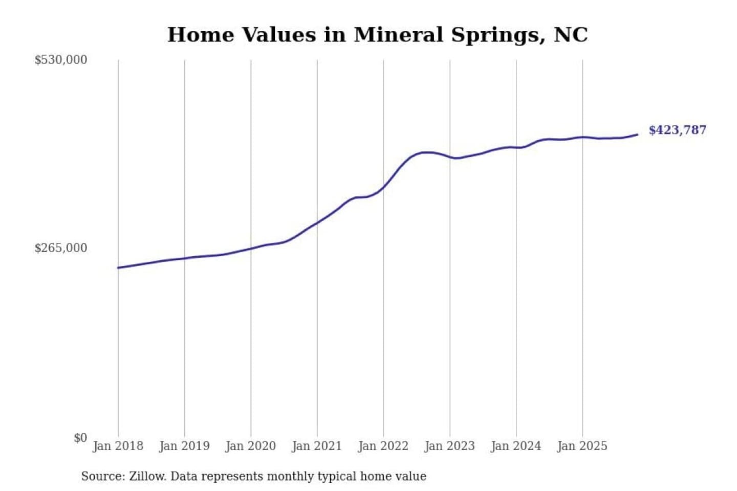 Stacker compiled a list of cities with the most expensive homes in the Charlotte-Concord-Gastonia, NC-SC metro area using data from Zillow. Charts show the monthly typical home value since January 2018.