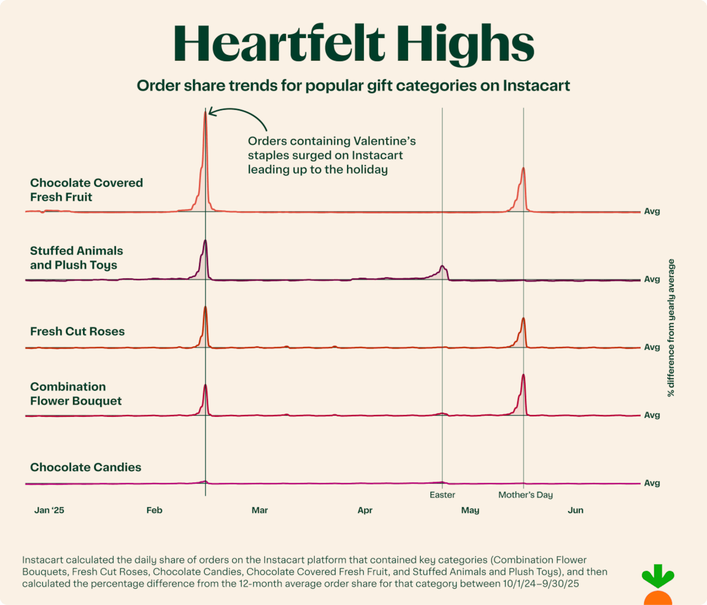 - Valentine's Day is a top-tier gifting moment on Instacart, ranking as the second biggest gifting day of the year, trailing only Mother's Day, driven largely by perfectly timed, last-minute gestures like same-day flower and chocolate deliveries.